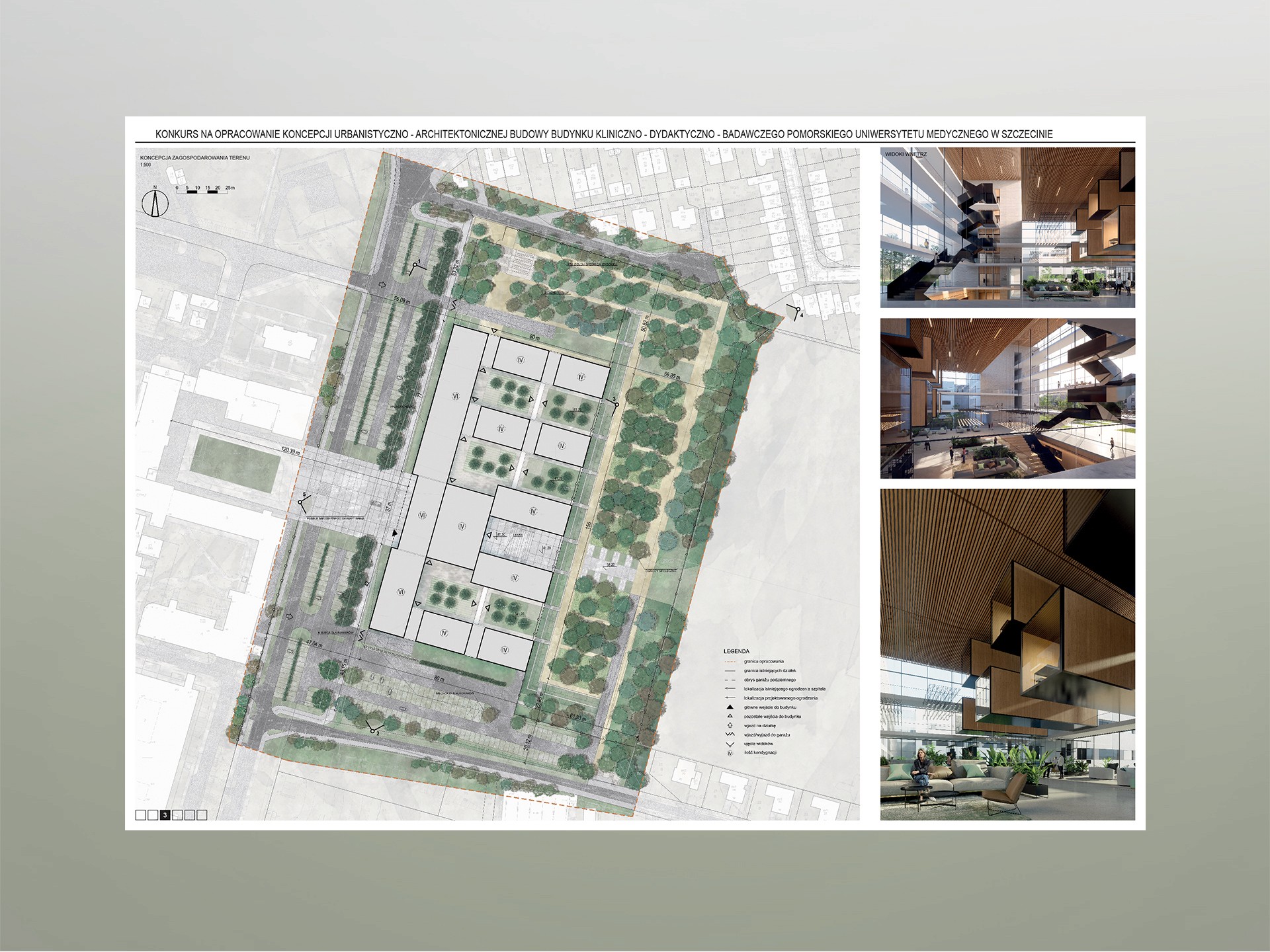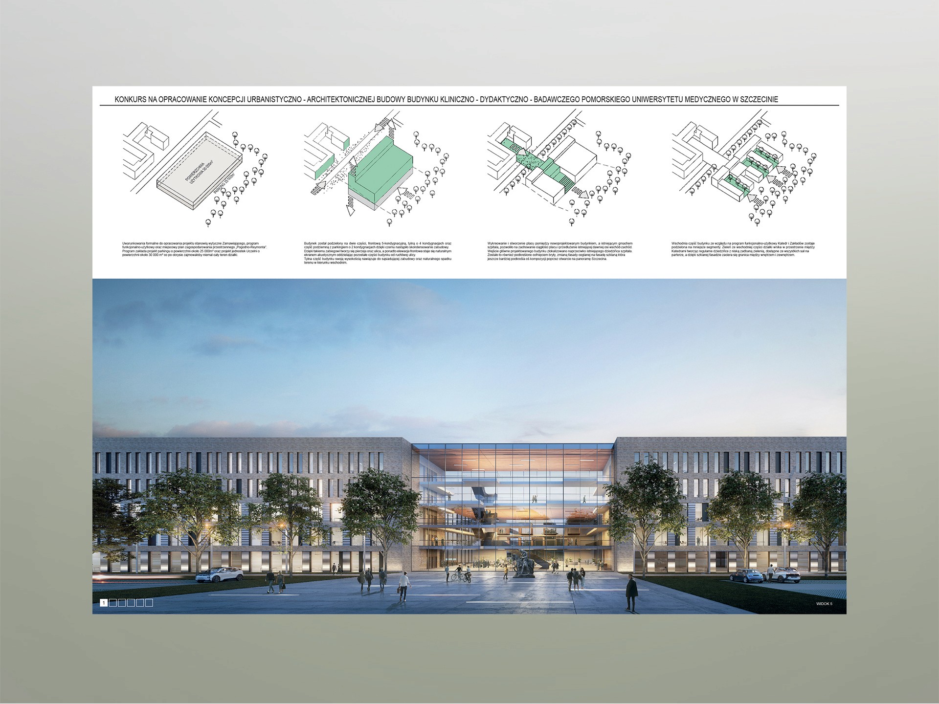 The competition focused on developing an urban and architectural concept for actual implementation. Participants had to design a clinical, teaching, and research building for the Pomeranian Medical University in Szczecin. The project could also be a complex of multiple buildings. The total usable floor area needed to be 55,000 m², with a 10% margin either way. This included all circulation areas, technical rooms, and auxiliary spaces. Indoor parking spaces were also required. The design had to include site development as well.